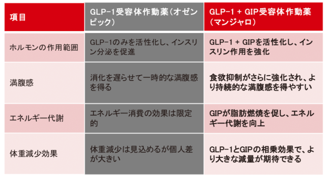 オゼンピックはGLP-1のみを活性化するのに対し、マンジャロはGLP-1に加えGIPも活性化します。