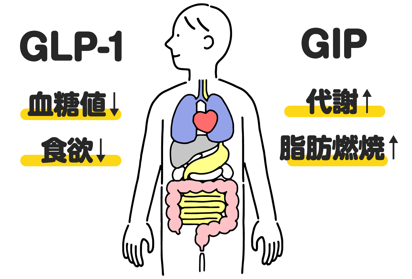 GLP-1は血糖値を下げたり、食欲を抑えたりする役割がありますが、GIPは代謝や脂肪の燃焼をサポートします。